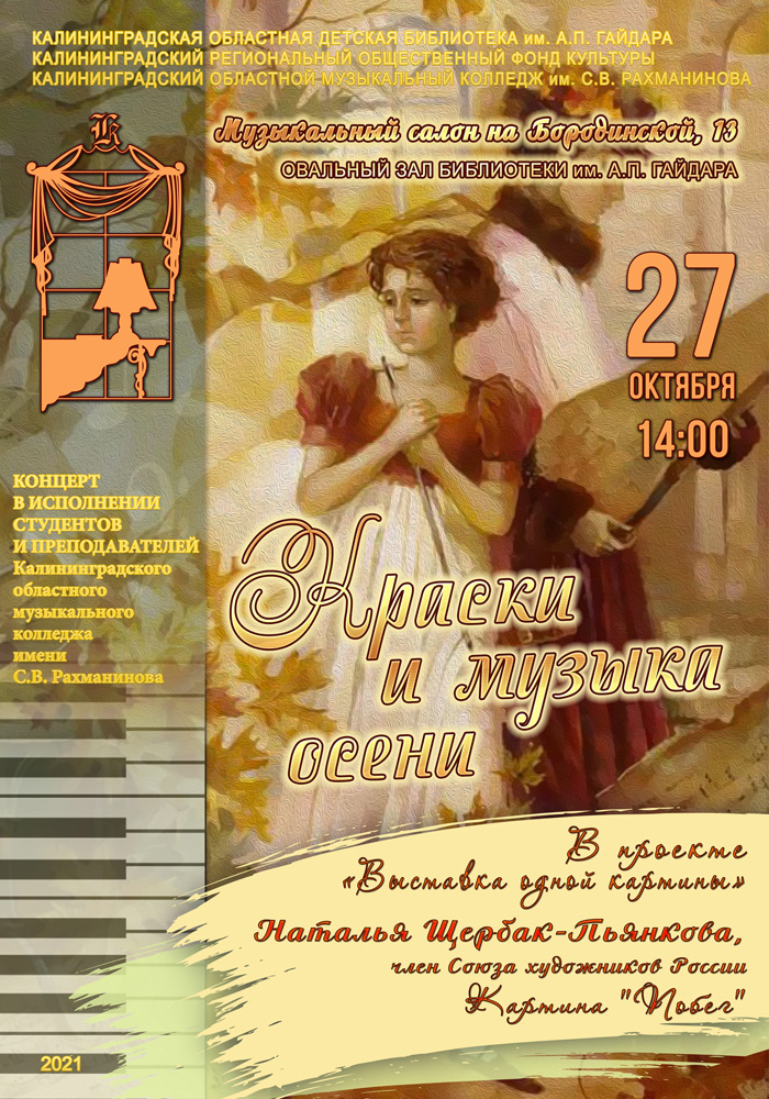 Калининградский областной музыкальный колледж им. С.В. Рахманинова, региональный общественный Фонд культуры и детскую областную библиотеку им. А.П. Гайдара связывают долгие годы сотрудничества. Ежемесячные встречи в Овальном зале библиотеки создают атмосферу единения с искусством еще и потому, что Союз Калининградских художников, присоединившийся к триумвирату, проводит в концертном зале презентации картин Калининградских художников.