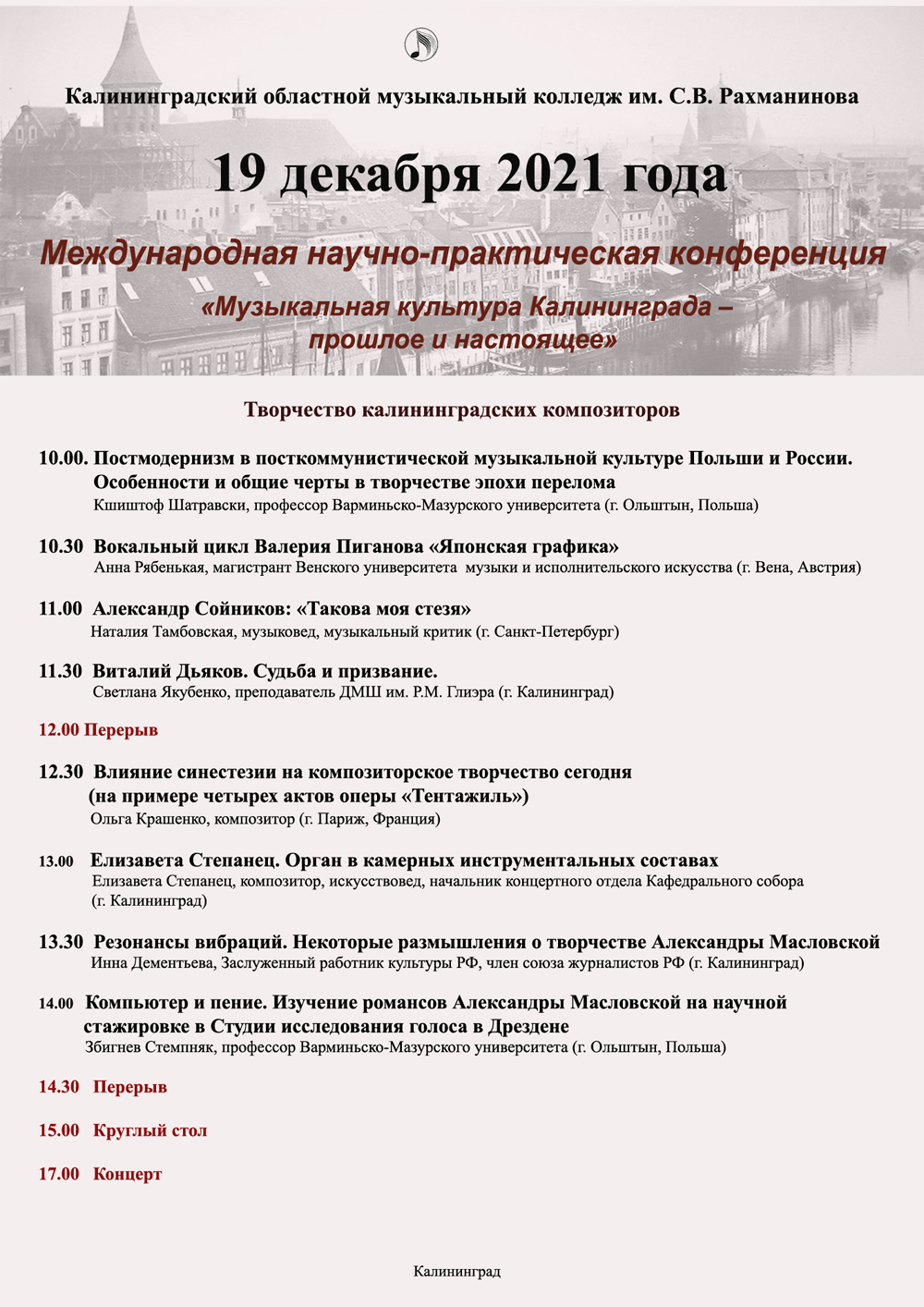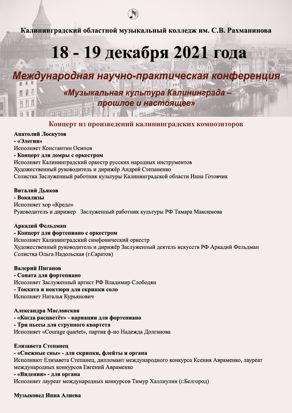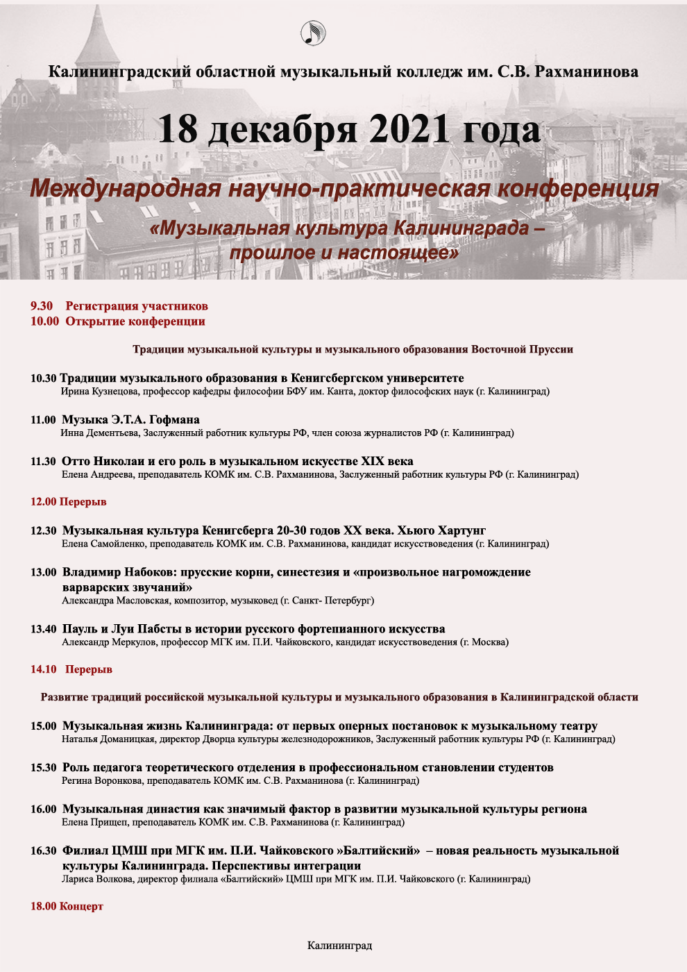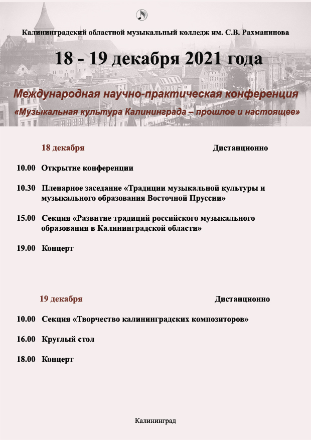 Приглашаем вас посетить мероприятия в рамках Третьей Международной научно-практической конференции «Музыкальная культура Калининграда – прошлое и настоящее», которая состоится 18-19 декабря 2021 года в дистанционном формате.